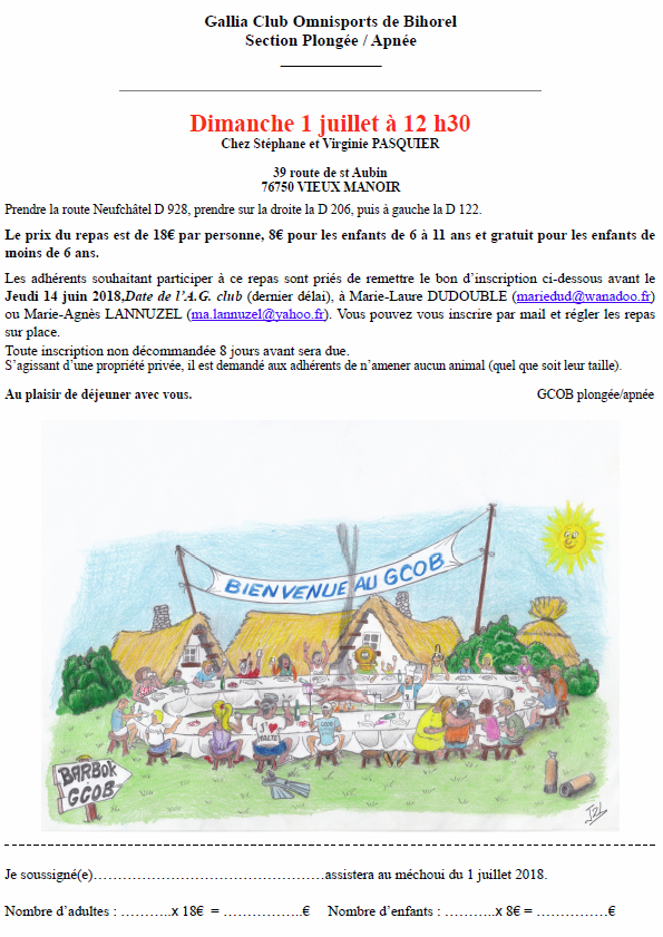 Cette année la soirée de rentrée sera le samedi 16 novembre 2019. Les inscriptions sont à faire auprès de Marie-Agnès gcobplongée76@gmail.com ou ma.lannuzel@yahoo.fr.